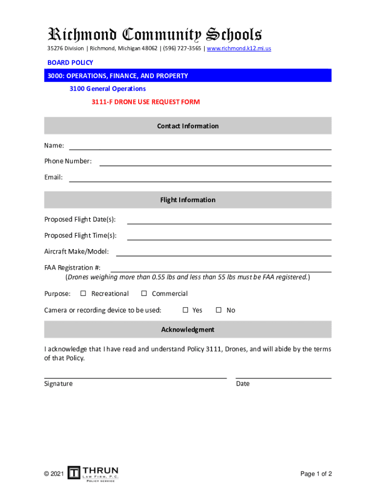 Richmond Community Schools 35276 Division | Richmond, Michigan 48062 | (596) 7273565 | www.richmond.k12.mi.usBOARD POLICY 3000: OPERATIONS, FINANCE, AND PROPERTY 3100 General Operations 3111F DRONE