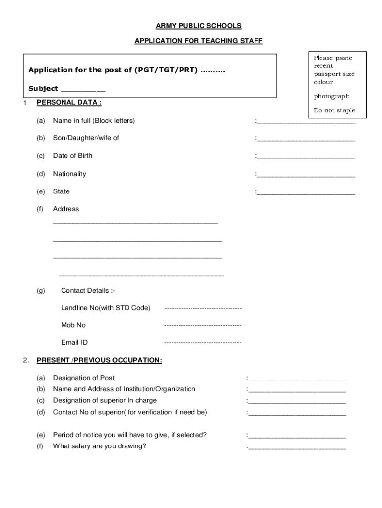 ARMY PUBLIC SCHOOLS APPLICATION FOR TEACHING STAFFApplication for the post of (PGT/TNT/PRT). Subject ___Please paste recent passport size color photograph1PERSONAL DATA : Do not staple(a)Name in full