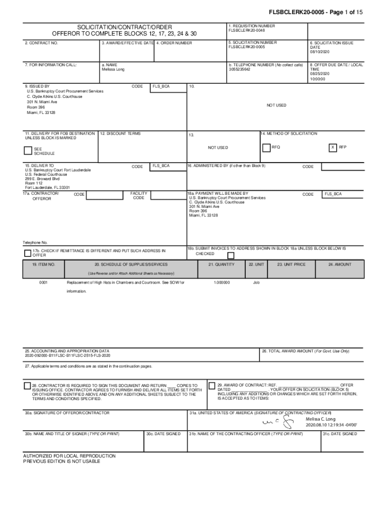 FLSBCLERK200005 Page 1 of 15 1. REQUISITION NUMBER FLSBCLERK200048SOLICITATION/CONTRACT/ORDER OFFER OR TO COMPLETE BLOCKS 12, 17, 23, 24 & 30 2. CONTRACT NO.3. AWARD/EFFECTIVE DATE 4. ORDER NUMBER5.