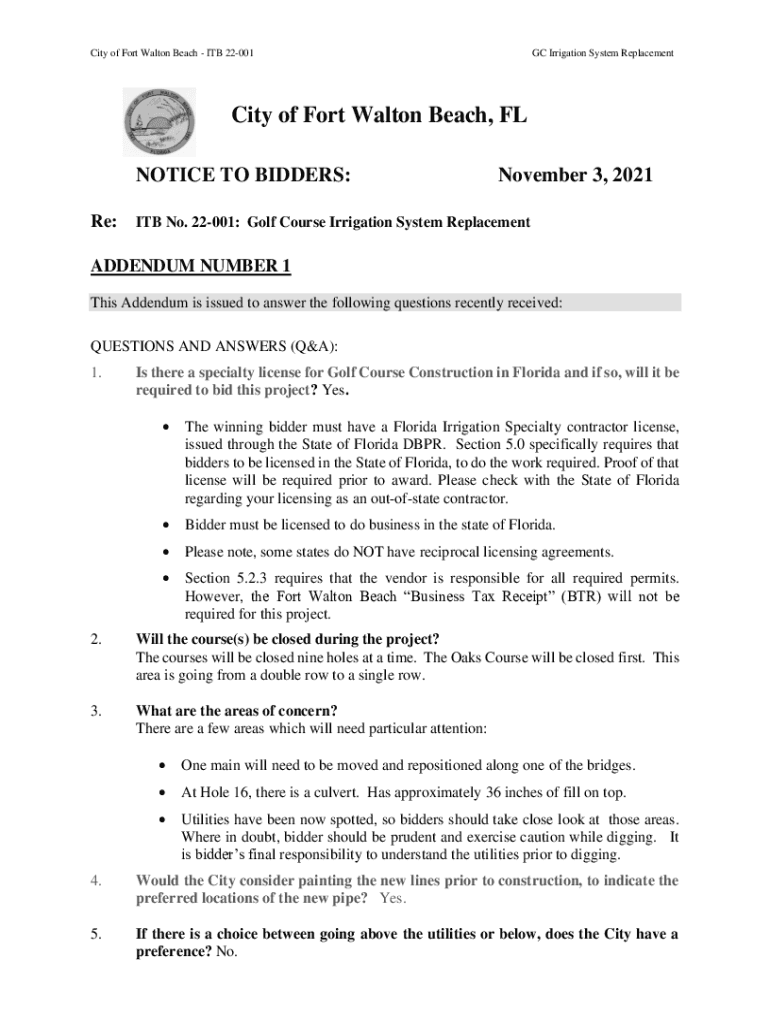 City of Fort Walton Beach ITB 22001GC Irrigation System ReplacementCity of Fort Walton Beach, FL NOTICE TO BIDDERS: Re:November 3, 2021ITB No. 22001: Golf Course Irrigation System ReplacementADDENDUM