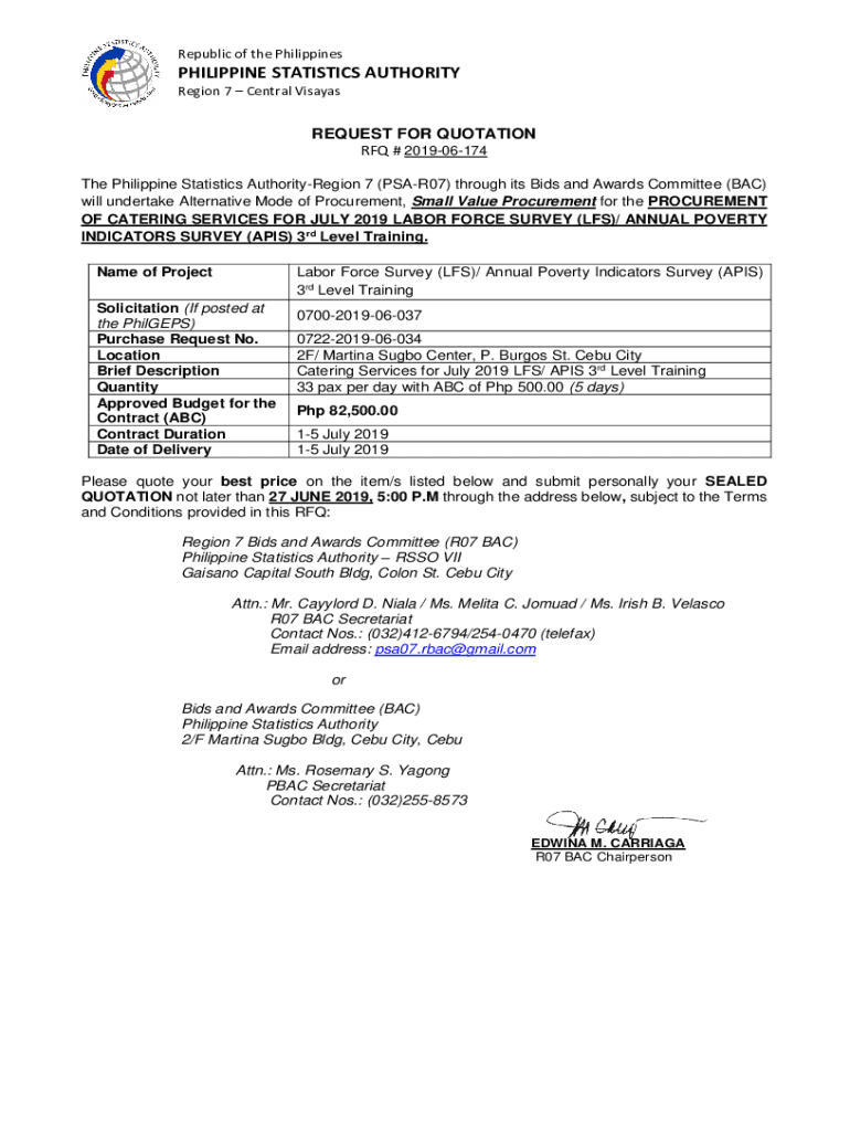 Republic of the PhilippinesPHILIPPINE STATISTICS AUTHORITY Region 7 Central VisayasREQUEST FOR QUOTATION RFQ # 201906174 The Philippine Statistics AuthorityRegion 7 (PSAR07) through its Bids and Awards
