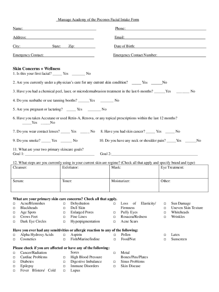 Massage Academy of the Poconos Facial Intake Form Name:Phone:Address:Email:City:State:Zip:Date of Birth:Emergency Contact:Emergency Contact Number:Skin Concerns + Wellness 1. Is this your first facial?