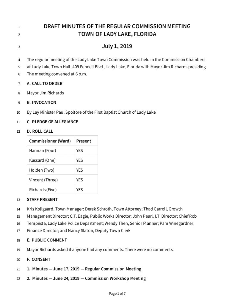 2DRAFT MINUTES OF THE REGULAR COMMISSION MEETING TOWN OF LADY LAKE, FLORIDA3July 1, 20194The regular meeting of the Lady Lake Town Commission was held in the Commission Chambers5at Lady Lake Town