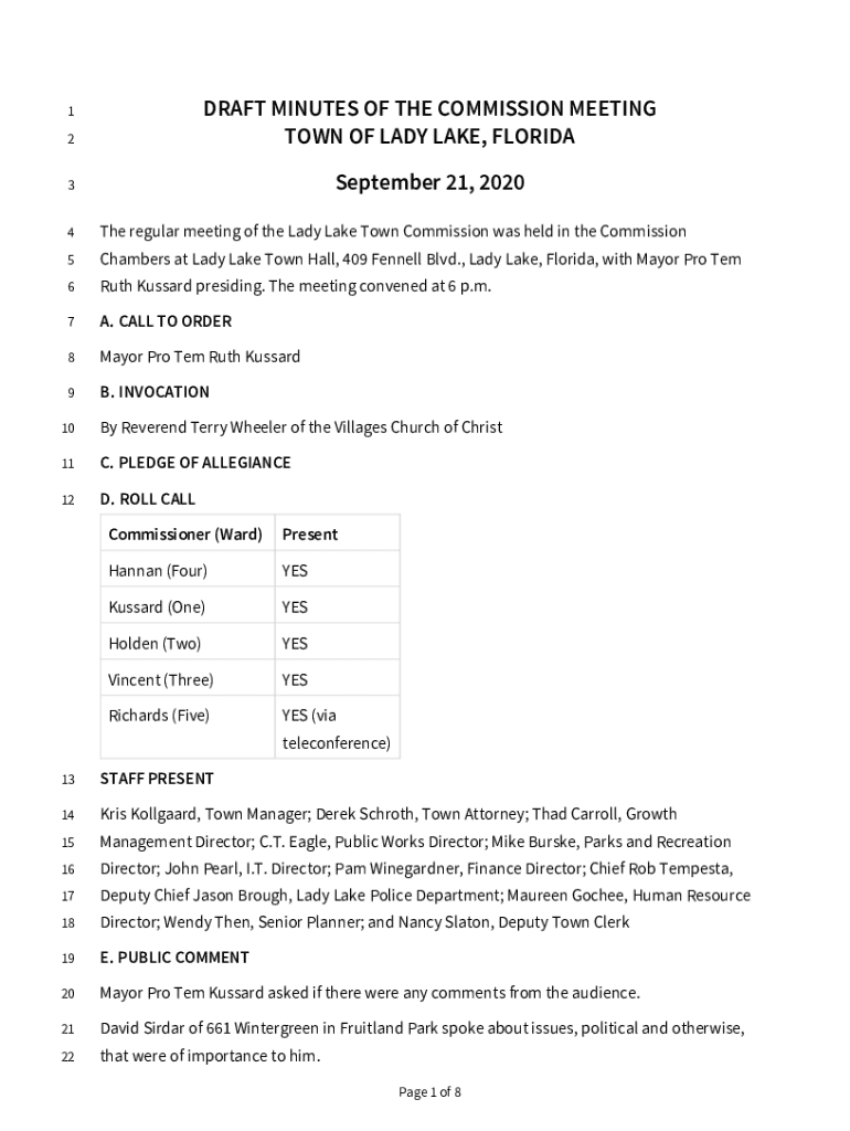 2DRAFT MINUTES OF THE COMMISSION MEETING TOWN OF LADY LAKE, FLORIDA3September 21, 202014The regular meeting of the Lady Lake Town Commission was held in the Commission5Chambers at Lady Lake Town Hall,