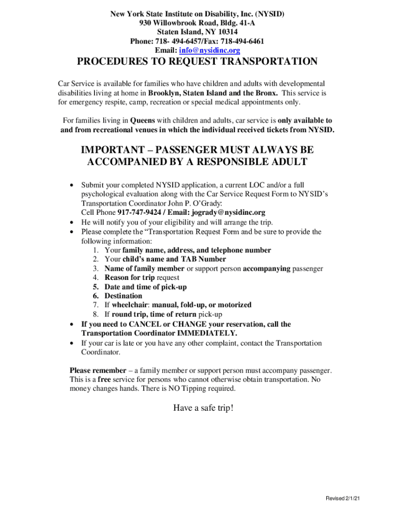 New York State Institute on Disability, Inc. (NY SID) 930 Willowbrook Road, Bldg. 41A Staten Island, NY 10314 Phone: 718 4946457/Fax: 7184946461 Email: info@nysidinc.orgPROCEDURES TO REQUEST TRANSPORTATION