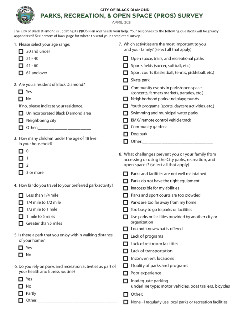 City of Black Diamondbacks, RECREATION, & open space (PROS) Survey April 2021 The City of Black Diamond is up dang its PROS Plan and needs your help. Your responses to the following questions will
