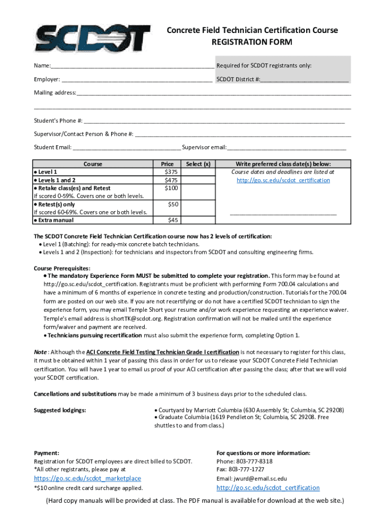 Get the free scdot-concrete-field-technician-certification-course-reg-form