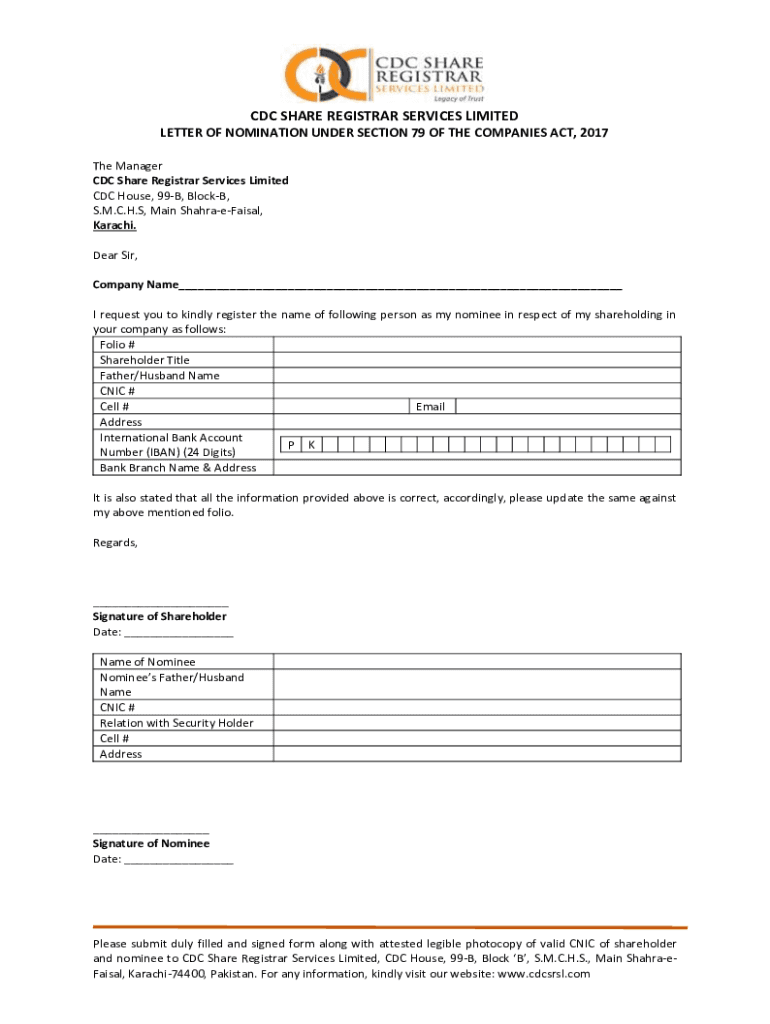 CDC SHARE REGISTRAR SERVICES LIMITED LETTER OF NOMINATION UNDER SECTION 79 OF THE COMPANIES ACT, 2017 The Manager CDC Share Registrar Services Limited CDC House, 99B, Block, S.M.C.H.S, Main ShahraeFaisal,