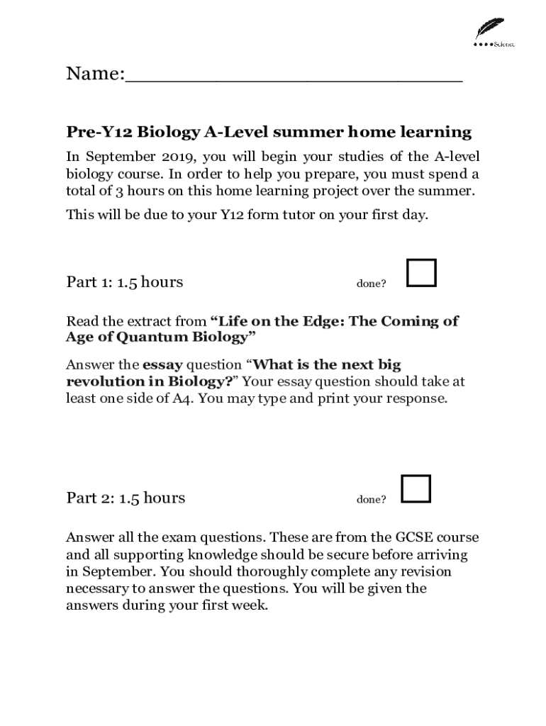 Name:___ PreY12 Biology Level summer home learning In September 2019, you will begin your studies of the Level biology course. In order to help you prepare, you must spend a total of 3 hours on this