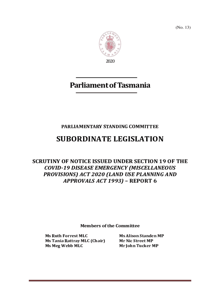 (No. 13)2020Parliament of TasmaniaPARLIAMENTARY STANDING COMMITTEESUBORDINATE LEGISLATION SCRUTINY OF NOTICE ISSUED UNDER SECTION 19 OF THE COVID-19 DISEASE EMERGENCY (MISCELLANEOUS PROVISIONS) ACT