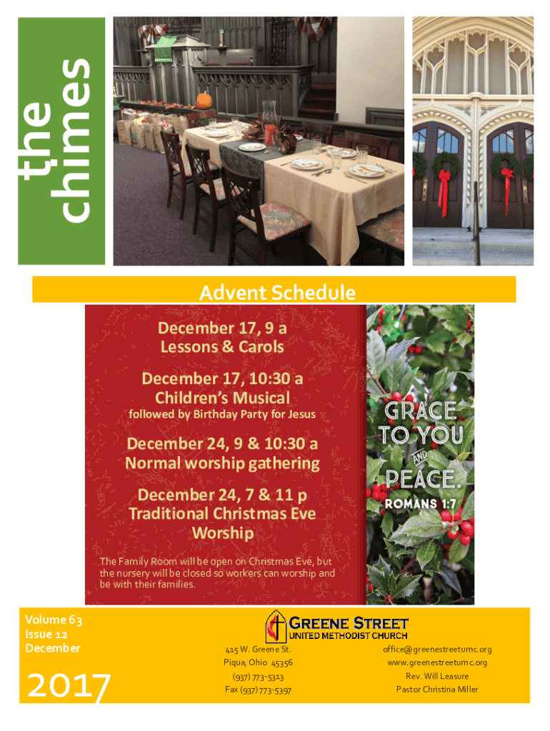 The chimes Advent Schedule December 17, 9 a Lessons & Carols December 17, 10:30 a Children's Musical followed by Birthday Party for Jesus December 24, 9 & 10:30 a Normal worship gathering December