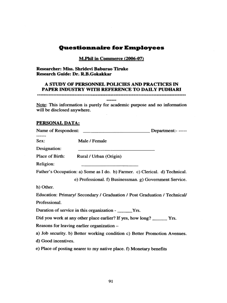 Questionnaire for Employees M. Phil in Commerce (200607) Researcher: Miss. Shrine Natural True Research Guide: Dr. R.B. Gokakkar A STUDY OF PERSONNEL POLICIES AND PRACTICES IN PAPER INDUSTRY WITH