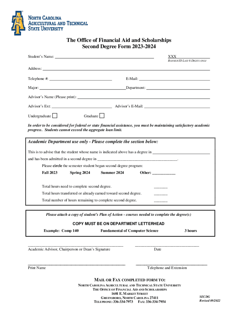 The Office of Financial Aid and Scholarships Second Degree Form 20232024 Students Name:BANNER ID LAST 6 DIGITS ONLYAddress: Telephone #:Email:Major:Department:Advisors Name (Please print): Advisors