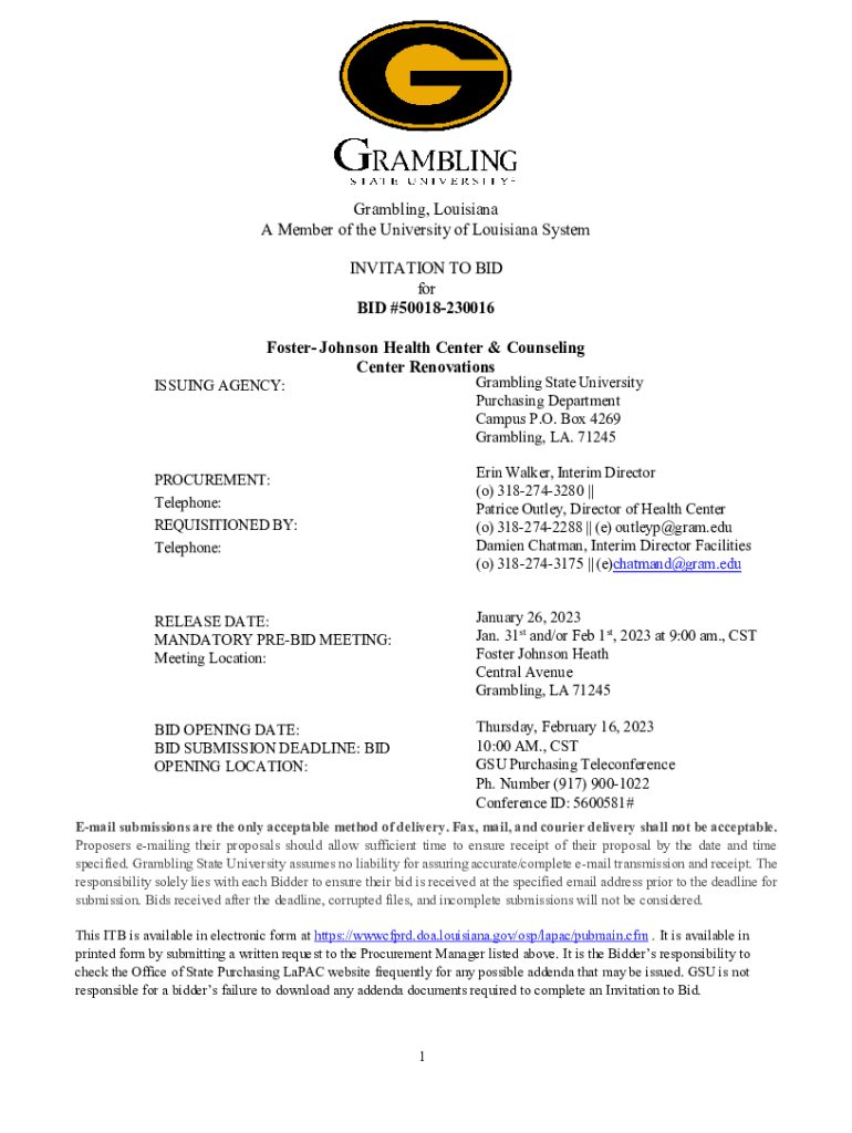 Gambling, Louisiana A Member of the University of Louisiana System INVITATION TO BID for BID #50018230016 Foster Johnson Health Center & Counseling Center RenovationsISSUING AGENCY:Gambling State