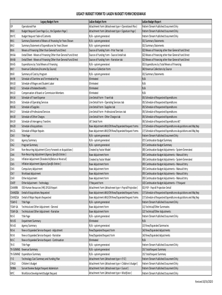 LEGACY BUDGET FORM TO LAGOS BUDGET FORM CROSSWALK OP BR0 BRIC BR1 BR2 BR6 BR6A BR6B BR6S BR7 BR8 BR9E BR10 BR12 BR13 BR14 BR15 BR16 BR17 BR18 BR19 BR20 BR21 CB0 CB1 CB2 CB4 CB5 CB6 CB7 CB8 CB8T CBBR9B