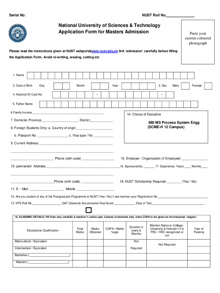 Serial No:MUST Roll No.___National University of Sciences & Technology Application Form for Masters AdmissionPaste your current colored photographPlease read the instructions given at MUST webportalwww.must.edu.pk