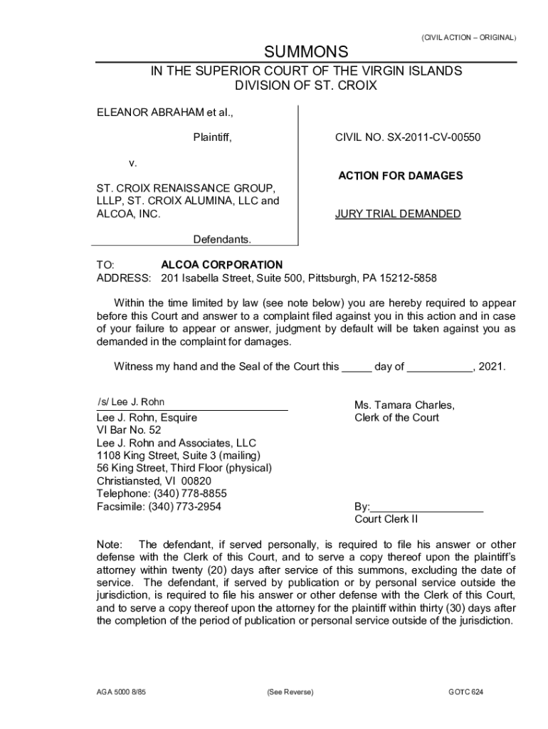SUMMONS(CIVIL ACTION ORIGINAL)IN THE SUPERIOR COURT OF THE VIRGIN ISLANDS DIVISION OF ST. CROIX ELEANOR ABRAHAM et al., Plaintiff, CIVIL NO. SX2011CV00550v. ST. CROIX RENAISSANCE GROUP, LL LP, ST.