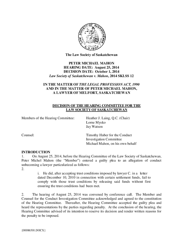 The Law Society of Saskatchewan PETER MICHAEL MASON HEARING DATE: August 25, 2014, DECISION DATE: October 1, 2014, Law Society of Saskatchewan v. Mason, 2014 SALES 12 IN THE MATTER OF THE LEGAL PROFESSION