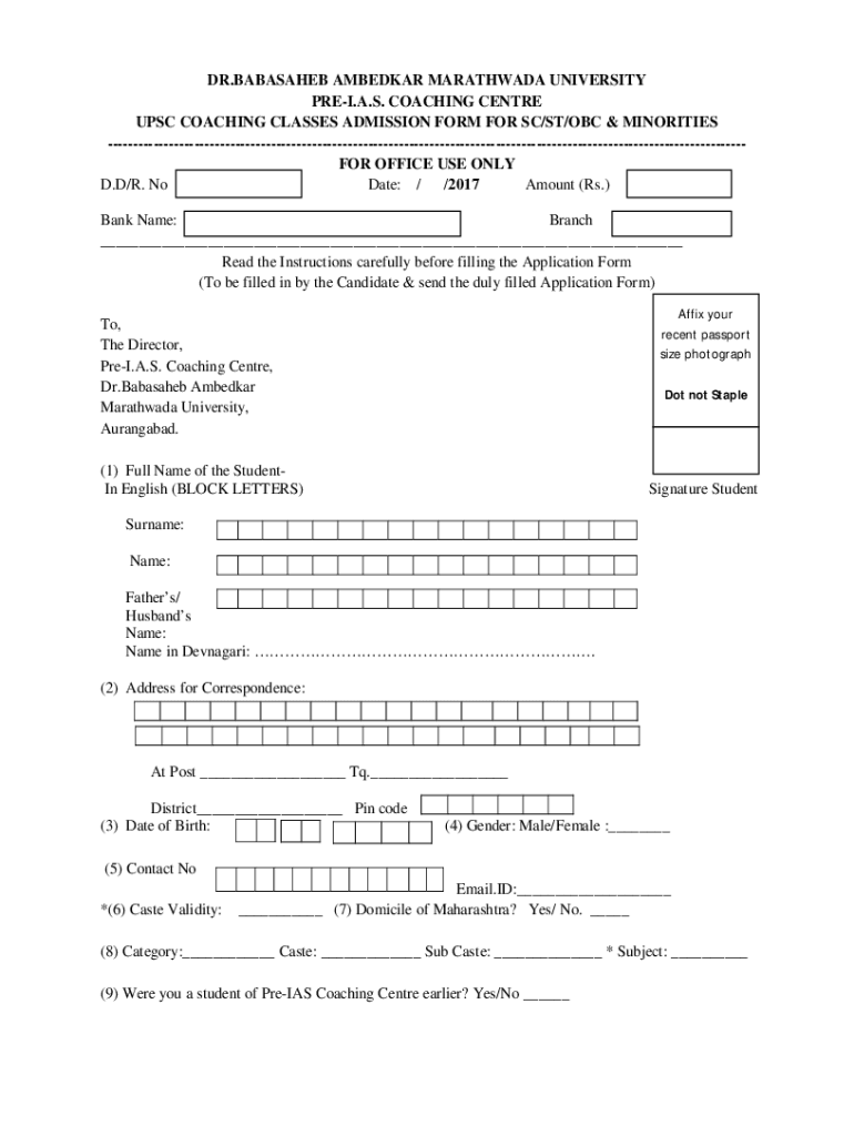 UPSC COACHING CLASSES ADMISSION FORM FOR SC/ST/OBC & MINORITIES