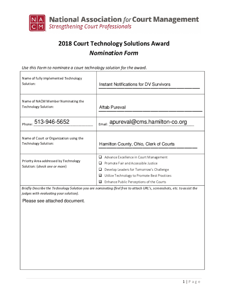 2018 Court Technology Solutions Award Nomination Form Use this Form to nominate a court technology solution for the award. Name of fully implemented Technology Solution:Name of ACM Member Nominating