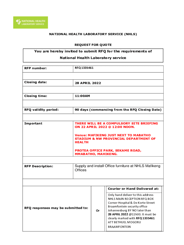 NATIONAL HEALTH LABORATORY SERVICE (NHS) REQUEST FOR Quoted are hereby invited to submit RFQ for the requirements of National Health Laboratory service RFP number:RFQ 1335461Closing date:28 APRIL