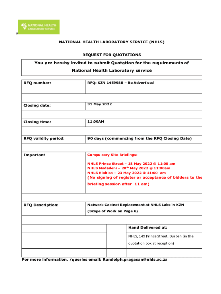 U NATIONAL HEALTH LABORATORY SERVICE (NHS) REQUEST FOR Quotations are hereby invited to submit Quotation for the requirements of National Health Laboratory service RFQ number:RFQ: KIN 1459988 Re AdvertisedClosing