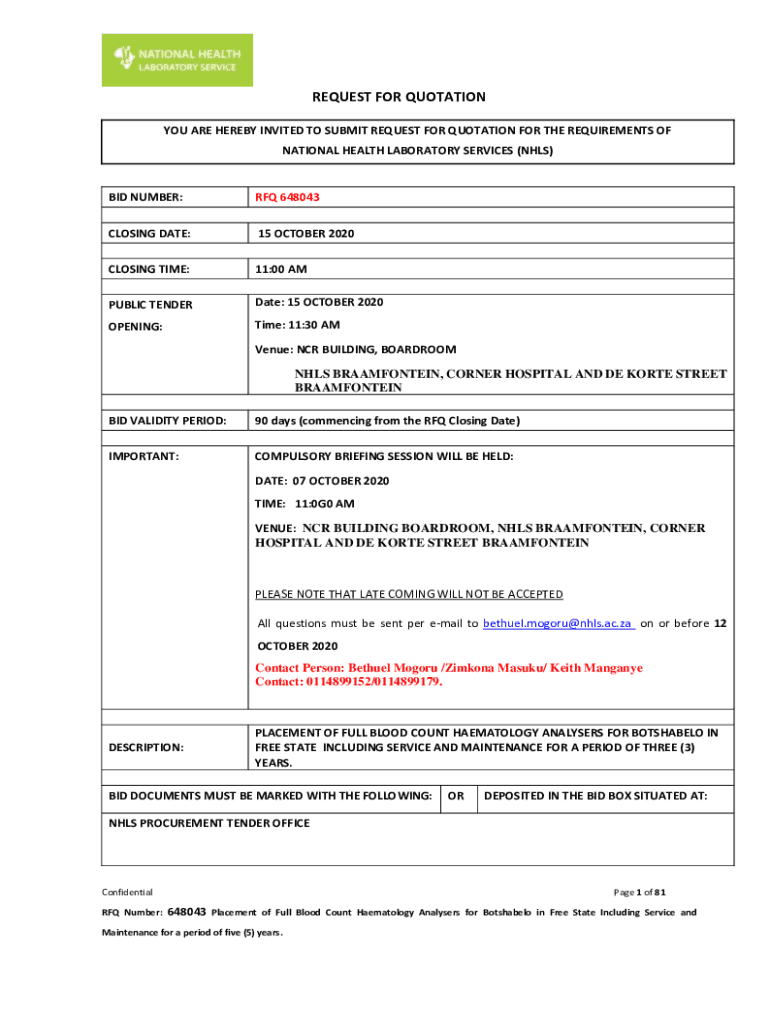 REQUEST FOR QUOTATION YOU ARE HEREBY INVITED TO SUBMIT REQUEST FOR QUOTATION FOR THE REQUIREMENTS OF NATIONAL HEALTH LABORATORY SERVICES (NHS)BID NUMBER:RFQ 648043CLOSING DATE:15 OCTOBER 2020CLOSING