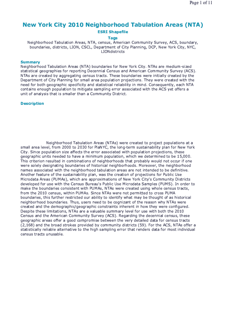 Page 1 of 11New York City 2010 Neighborhood Tabulation Areas (TNA) ESRI Shape file Tags Neighborhood Tabulation Areas, TNA, census, American Community Survey, ACS, boundary, boundaries, districts,