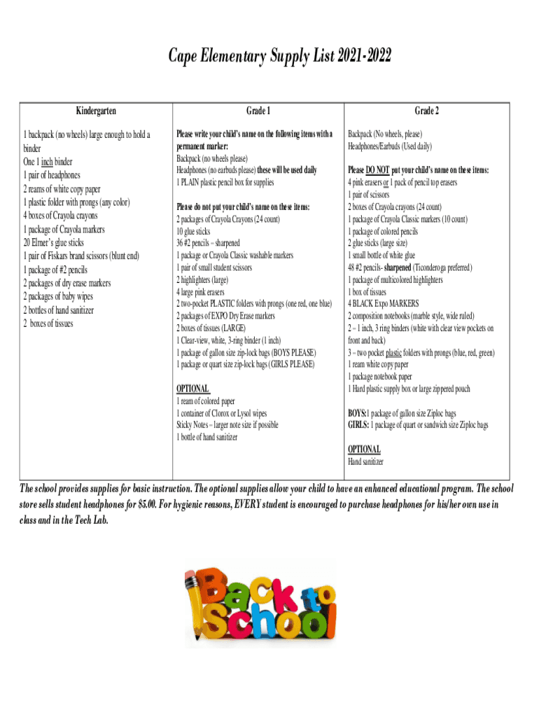 Cape Elementary Supply List 20212022 Kindergarten 1 backpack (no wheels) large enough to hold a binder One 1-inch binder 1 pair of headphones 2 reams of white copy paper 1 plastic folder with prongs