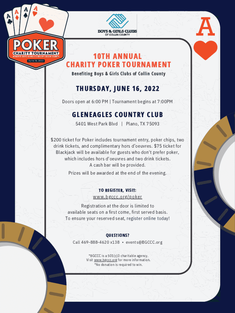 Presented benefits BEE NE FITS BOYS & GIRLS GIG ROSS CLUBS C L UP B S OF COLLIN C O L LIN COUNTY C OUNTYJune 16, 202210TH ANNUAL CHARITY POKER TOURNAMENT Benefiting Boys & Girls Clubs of Collin CountyTHURSDAY,