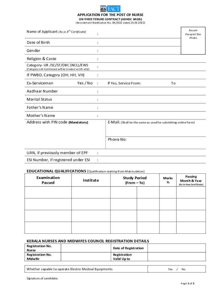 APPLICATION FOR THE POST OF NURSE ON FIXED TENURE CONTRACT (HOC BASIS) (Recruitment Notification No. 04/2022 dated 24.05.2022)Name of Applicant (As in PTH Certificate)Date of Birth:Gender:Religion