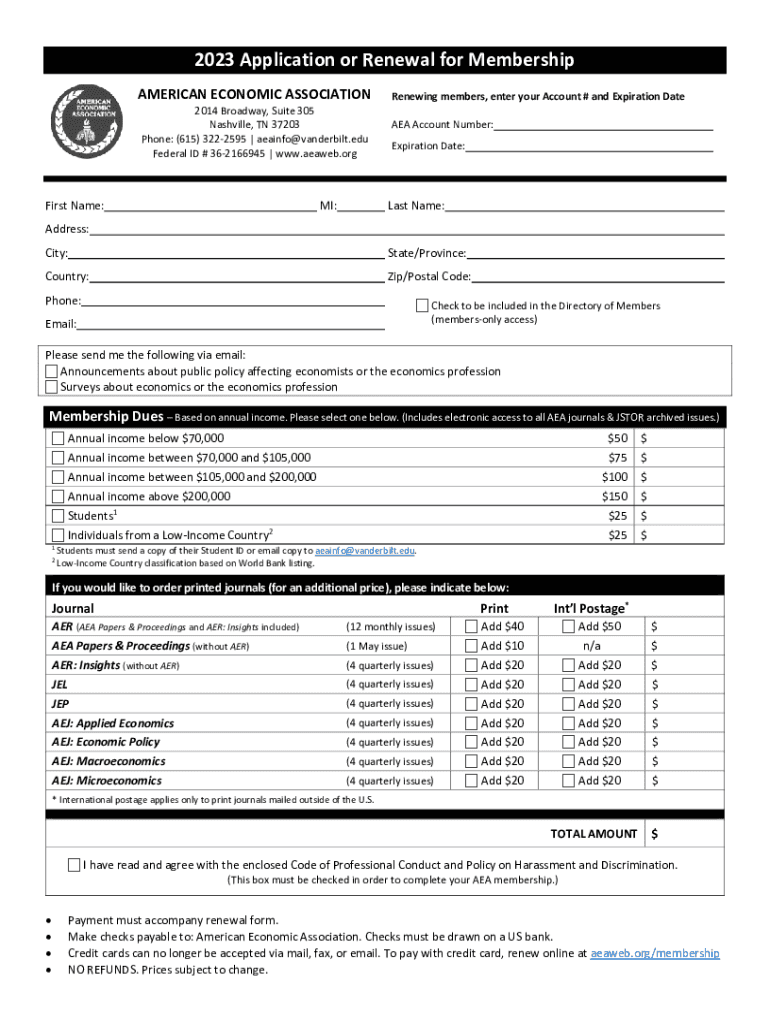 2023 Application or Renewal for Membership AMERICAN ECONOMIC ASSOCIATION 2014 Broadway, Suite 305 Nashville, TN 37203 Phone: (615) 3222595 | aeainfo@vanderbilt.edu Federal ID # 362166945 | www.aeaweb.orgFirst