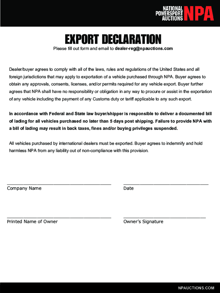 EXPORT DECLARATIONPlease fill out form and email to dealerreg@npauctions.comDealer/buyer agrees to comply with all the laws, rules and regulations of the United States and all foreign jurisdictions