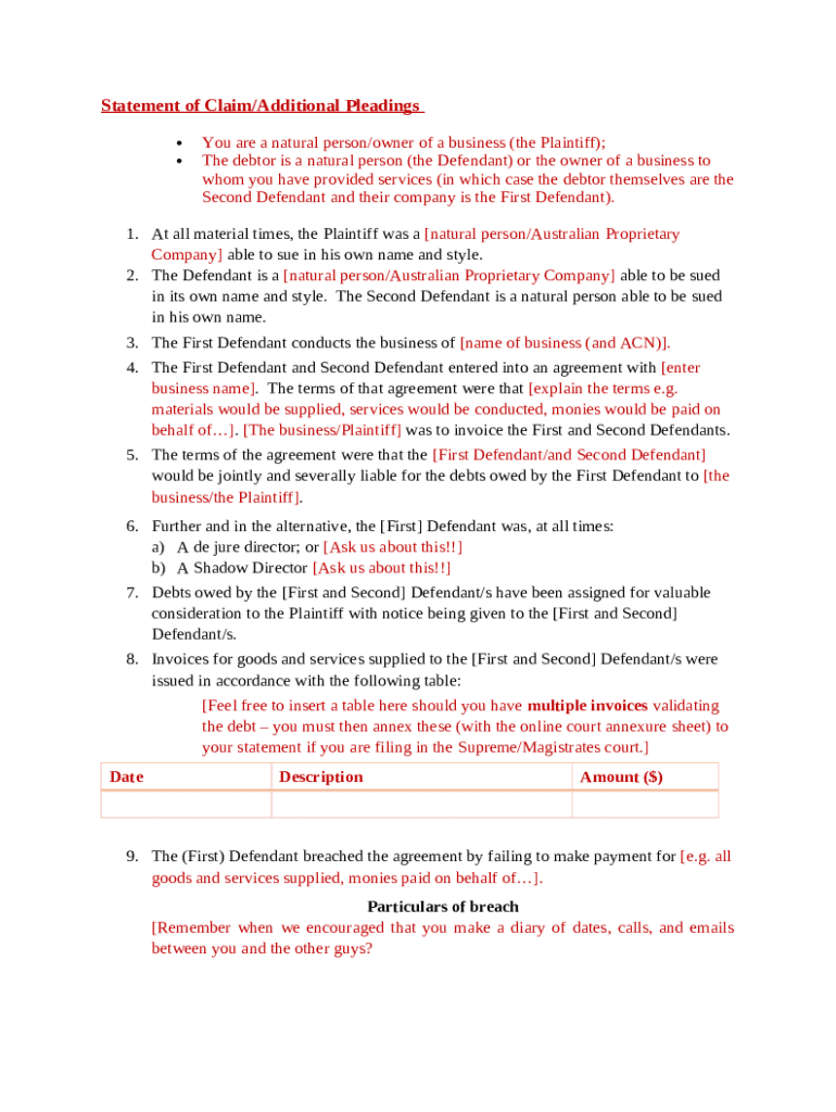 Instructions for the Statement of Claim/Additional Pleadings - United Legal form