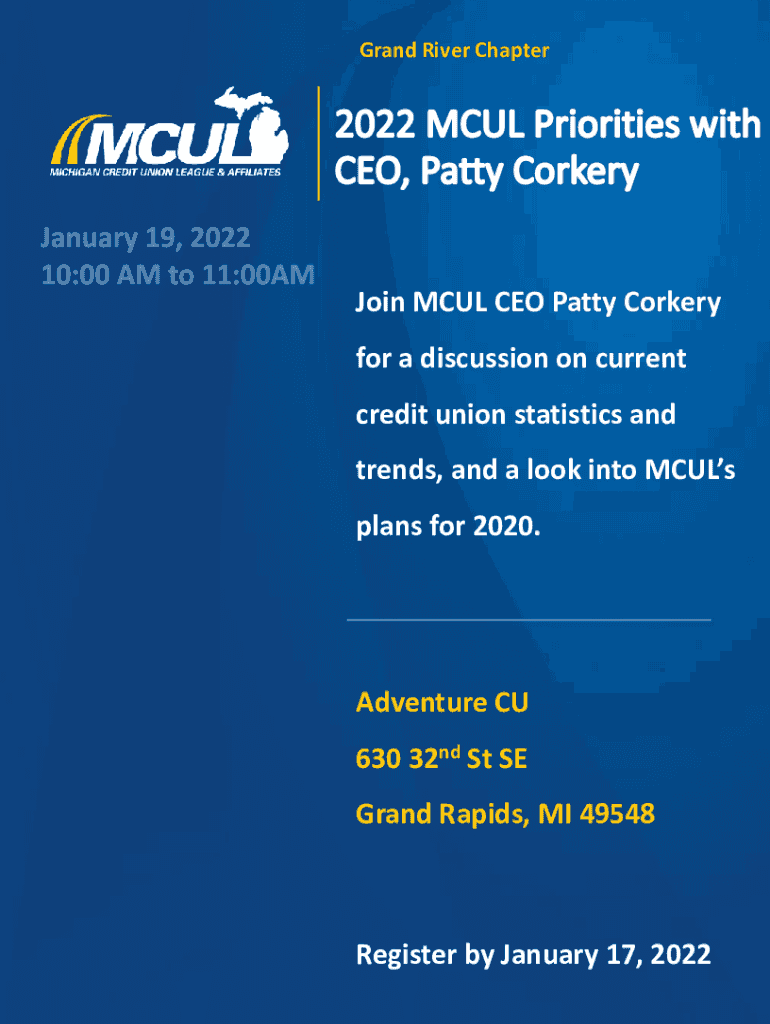 Grand River Chatterton MCL CEO Patty Corkeryfor a discussion on current credit union statistics and trends, and a look into Mauls plans for 2020. Adventure CU 630 32nd St SEG rand Rapids, MI 49548Register