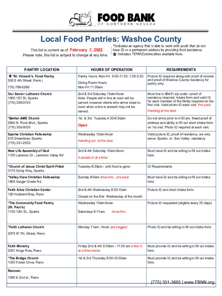Local Food Pantries: Washoe County This list is current as of February 7, 2022. Please note, this list is subject to change at any time. PANTRY LOCATION *St. Vincent's Food Pantry 500 E 4th Street,