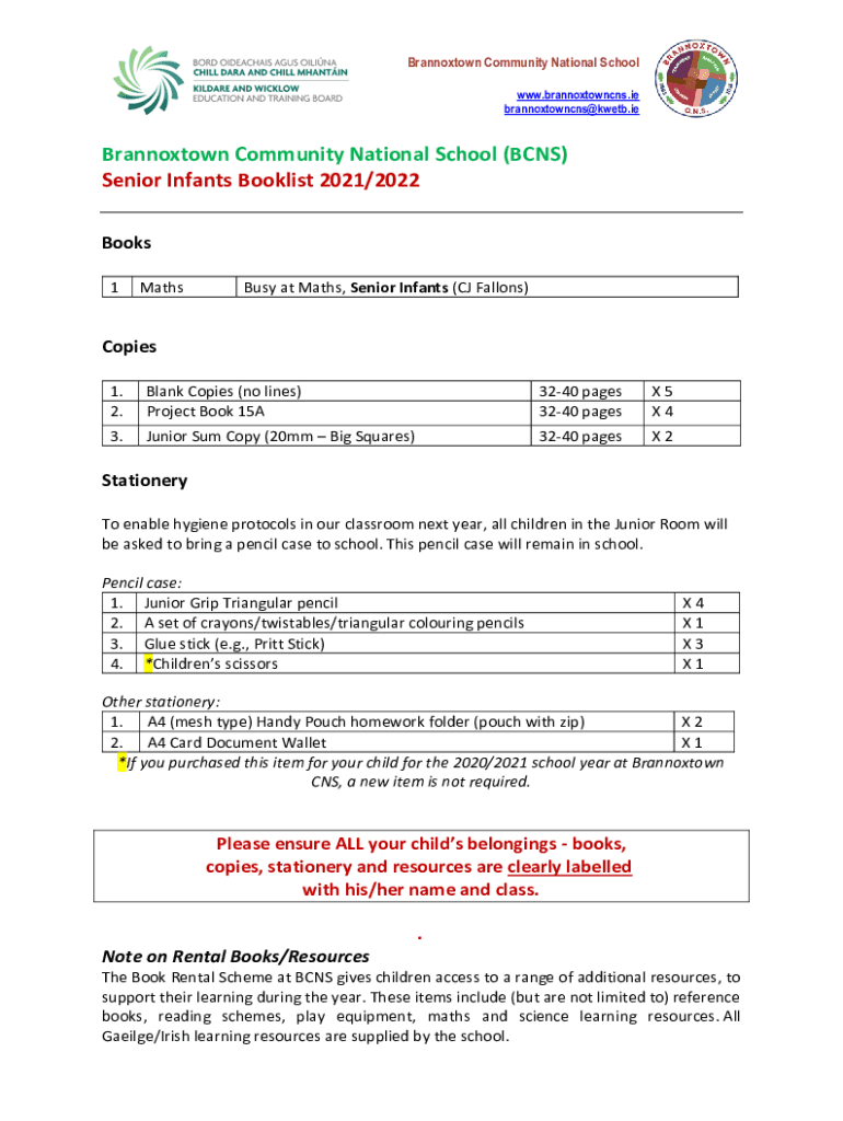 Brannoxtown Community National School www.brannoxtowncns.ie brannoxtowncns@kwetb.ieBrannoxtown Community National School (CNS) Senior Infants Book list 2021/2022 Books 1MathsBusy at Math, Senior Infants