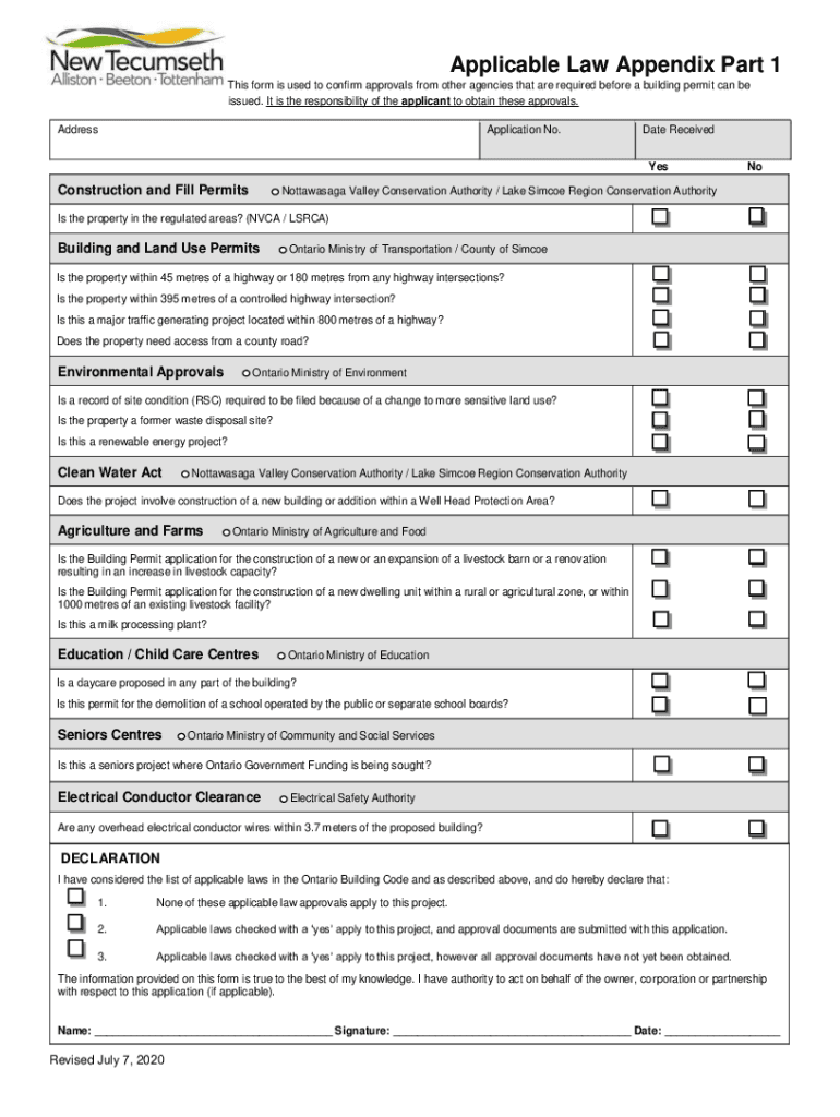 Applicable Law Appendix Part 1 This form is used to confirm approvals from other agencies that are required before a building permit can be issued. It is the responsibility of the applicant to obtain