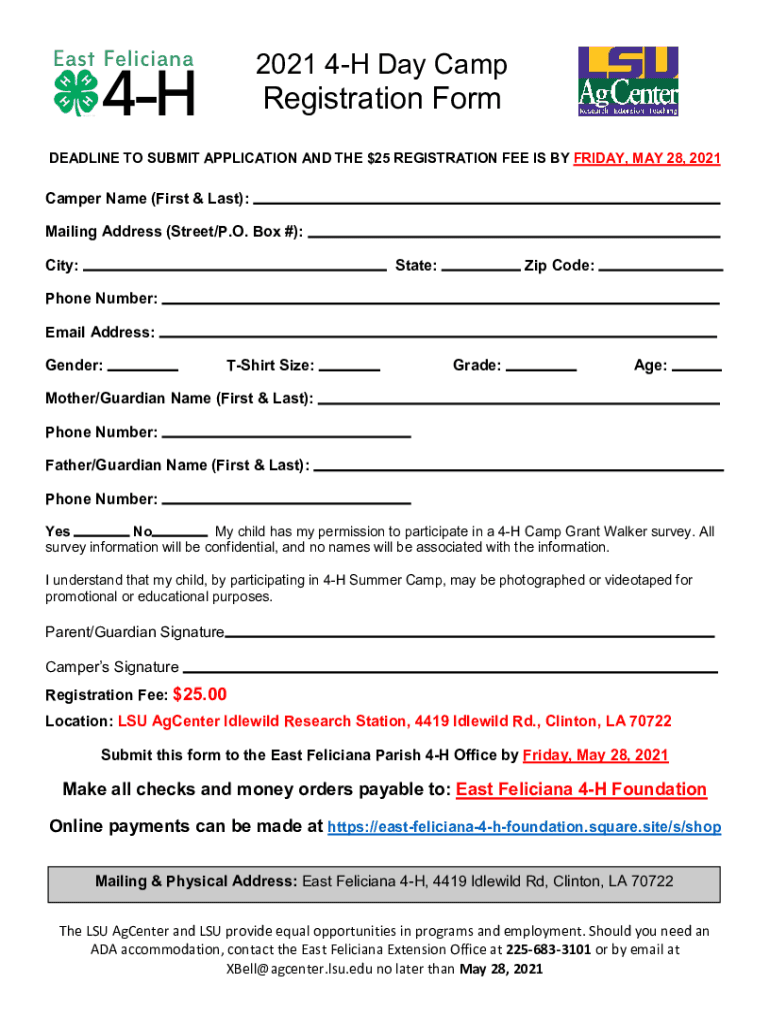 East Feliciano Cooperative Extension Service4H Youth Development4419 Idle wild Road Clinton, LA 70722 (225) 6833101 Fax: (225) 6833281 Website: www.lsuagcenter.com/eastfeliciana4hDear Eligible 4H