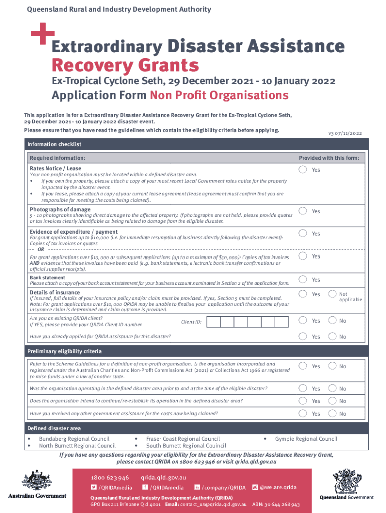 Queensland Rural and Industry Development AuthorityExtraordinary Disaster AssistanceRecovery GrantsExTropical Cyclone Seth, 29 December 2021 10 January 2022Application Form Non Profit Organizations