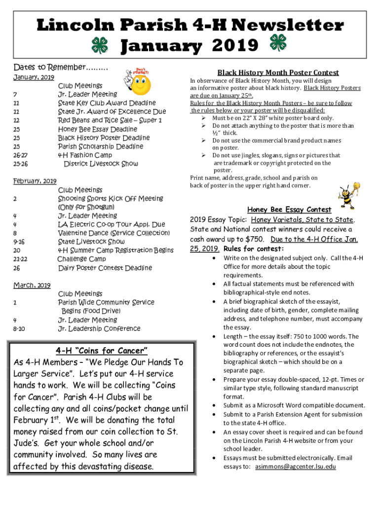Lincoln Parish 4H Newsletter January 2019 Dates to Remember January 2019 7 11 11 12 25 25 25 2627 2526Club Meetings Jr. Leader Meeting State Key Club Award Deadline State Jr. Award of Excellence Due