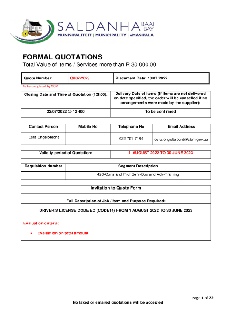 Quote Number:Q007/2023Placement Date: 13/07/2022To be completed by Closing Date and Time of Quotation (12h00):Delivery Date