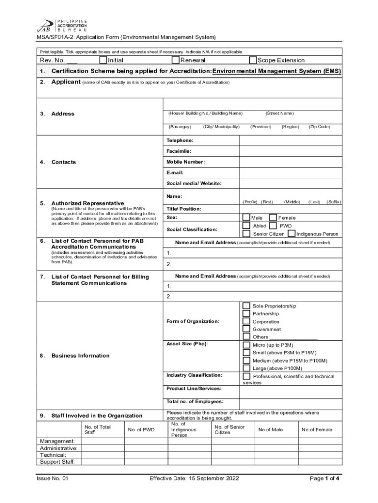 MSA/SF01A2: Application Form (Environmental Management System) Print legibly. Tick appropriate boxes and use separate sheet if necessary. Indicate N/A if not applicable. Rev. No. ___ Initial Renewal