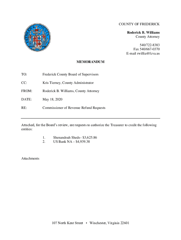 MEMORANDUM TO:Frederick County Board of Supervisors CC:Kris Tierney, County AdministratorFROM:Roderick