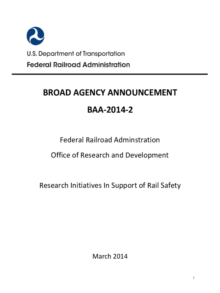 BROAD AGENCY ANNOUNCEMENT BAA20142 Federal Railroad Administration Office of Research and Development Research Initiatives In Support of Rail Safety March 2014 contents 123Introduction ..........................................................................................................................................