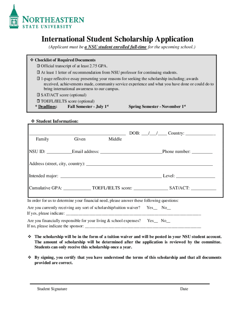 International Student Scholarship Application (Applicant must be a NSU student enrolled full time for the upcoming school.) Checklist of Required Documents Official transcript of at least 2.75 GPA.