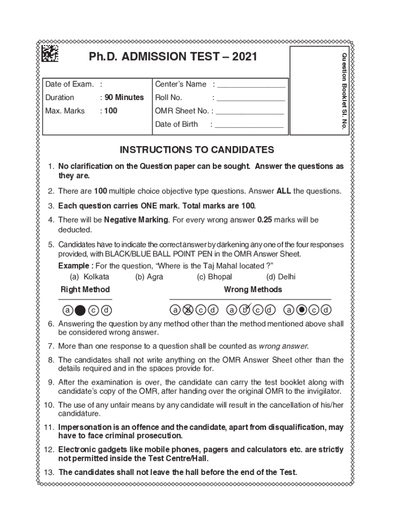 Ph.D. ADMISSION TEST 2021 Date of Exam. Centers Name : ___Duration: 90 MinutesRoll No. Max. Marks: 100OMR Sheet No. ___ Date of Birth: ___ : ___Question Booklet SL. No.INSTRUCTIONS TO CANDIDATES1.