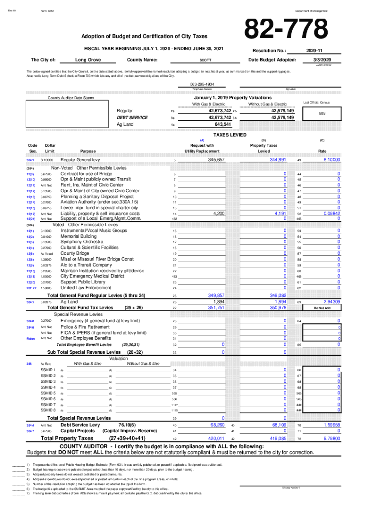 Dec18Form 635.1Department of Management182778Adoption of Budget and Certification of City Taxes FISCAL YEAR BEGINNING JULY 1, 2020, ENDING JUNE 30, 2021, The City of:County Name:Long GroveResolution