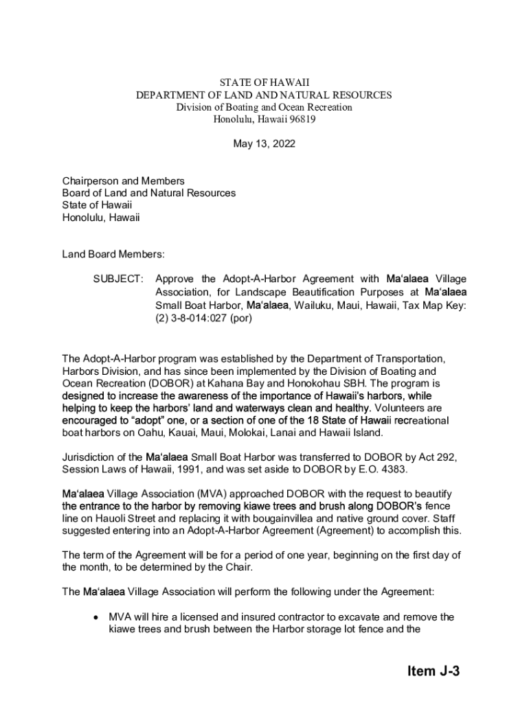 STATE OF HAWAII DEPARTMENT OF LAND AND NATURAL RESOURCES Division of Boating and Ocean Recreation Honolulu, Hawaii 96819 May 13, 2022, Chairperson and Members Board of Land and Natural Resources State