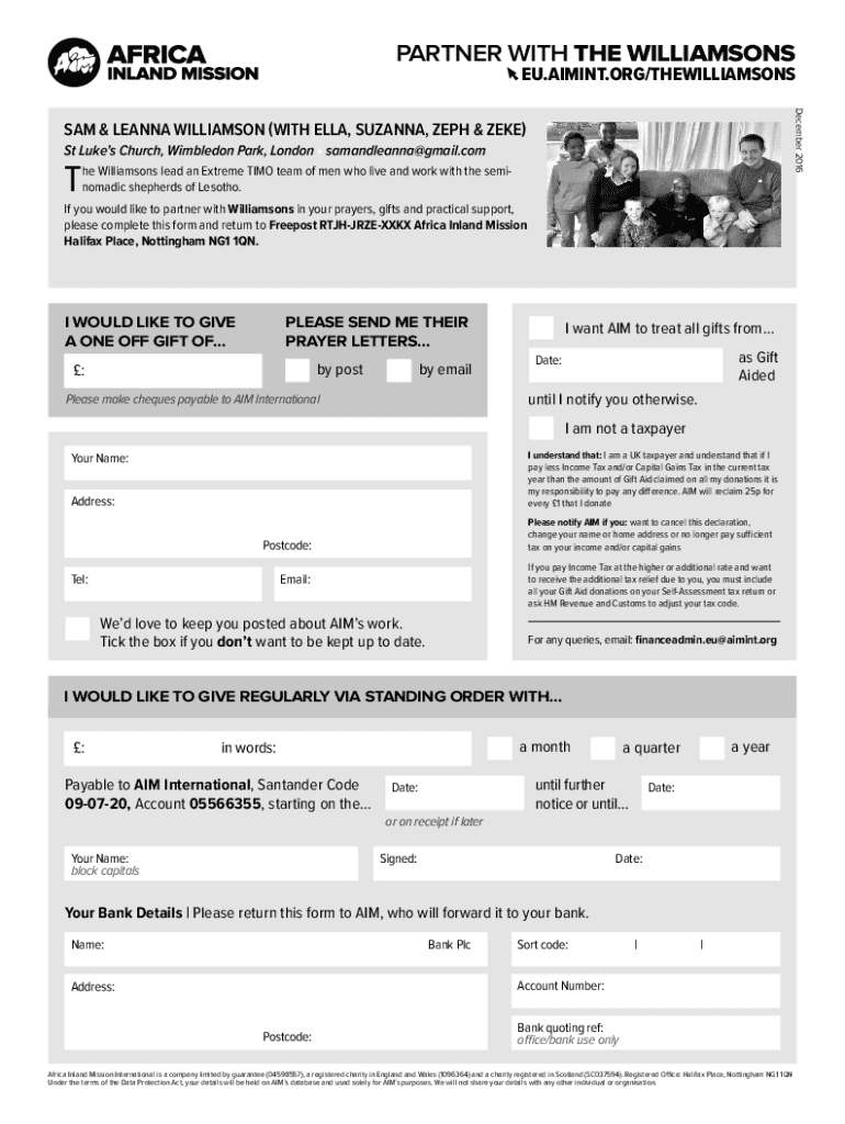 PARTNER WITH THE WILLIAMSONSEU.AIMINT.ORG/THEWILLIAMSONS williamsonsDecember 2016SAM & LEANNA WILLIAMSON (WITH ELLA, SUSANNA, ZEP & ZEKE) St Luke's Church, Wimbledon Park, London samandleanna@gmail.comThe
